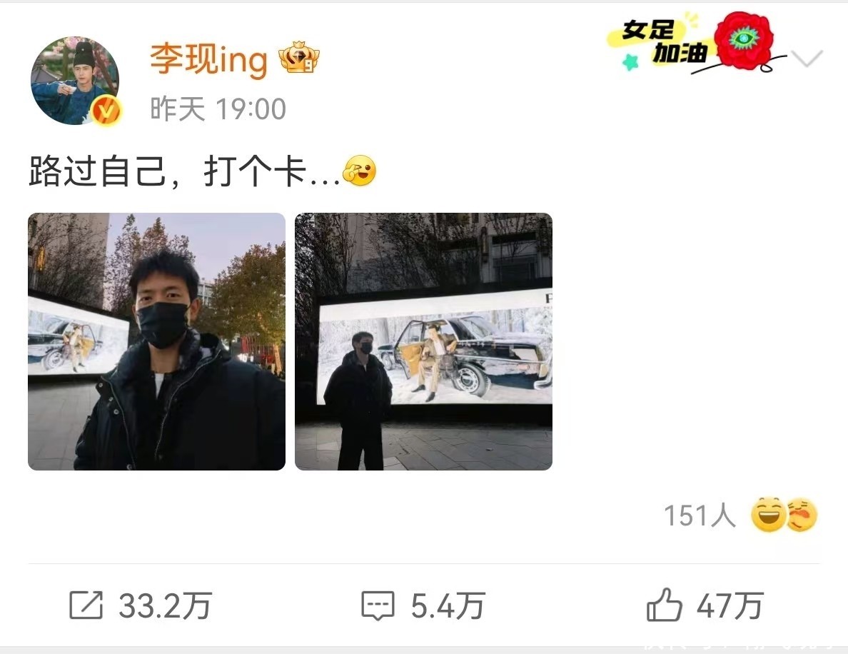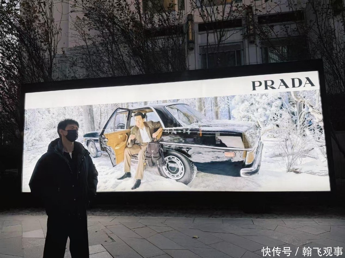 配图是他与户外广告牌的合影,仔细一看,正是他为奢侈品牌“PRADA”拍摄的代言海报。